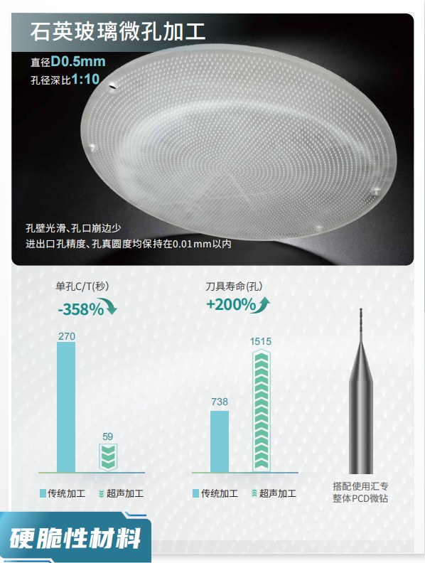 本加工案例需要在石英玻璃工件上加工出3800个直径为0.5mm的微孔,孔径深比达到1:10 。客户使用UHB-400进行加工,对比原加工方案,单孔加工时间由270秒降到59秒,效率提升3.5倍;刀具孔加工数量达到1515孔,寿命翻倍;同时,相对于传统钻削,超声加工条件下,孔壁光滑、孔口崩边少;进出口孔精度以及孔真圆度均保持在0.01mm以内。