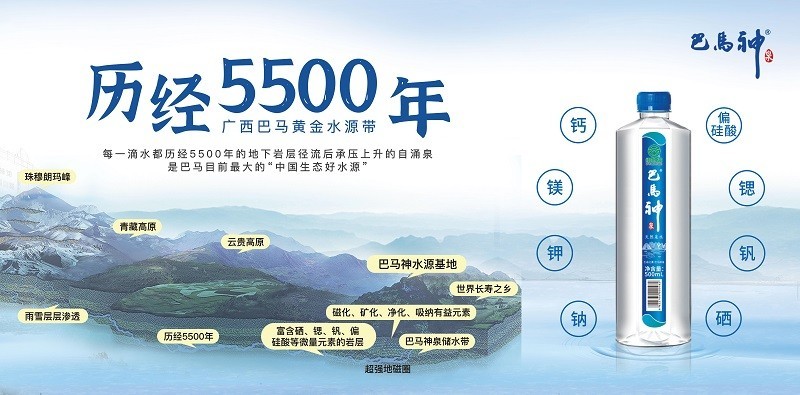 广西巴马神泉水业有限公司是一家专注于瓶装、桶装天然泉水饮用水生产和销售的创新型企业,广西著名商标品牌。巴马神泉水业拥有一流的生产厂房,数条领先的全自动生产线。巴马神泉就是发源于世界长寿之乡的巴马活泉,在历经5500年的喀斯特地层中形成,创造了四次进入地下潜行,又四次流出地表的自然奇观,独特的流程使之富含各种有益于人体、皮肤健康的矿物质和微量元素,其钙离子达到四十到八十毫克。“巴马神”高能态活性水荣获“2014第五届中国国际高端瓶装饮用水博览会金奖”。