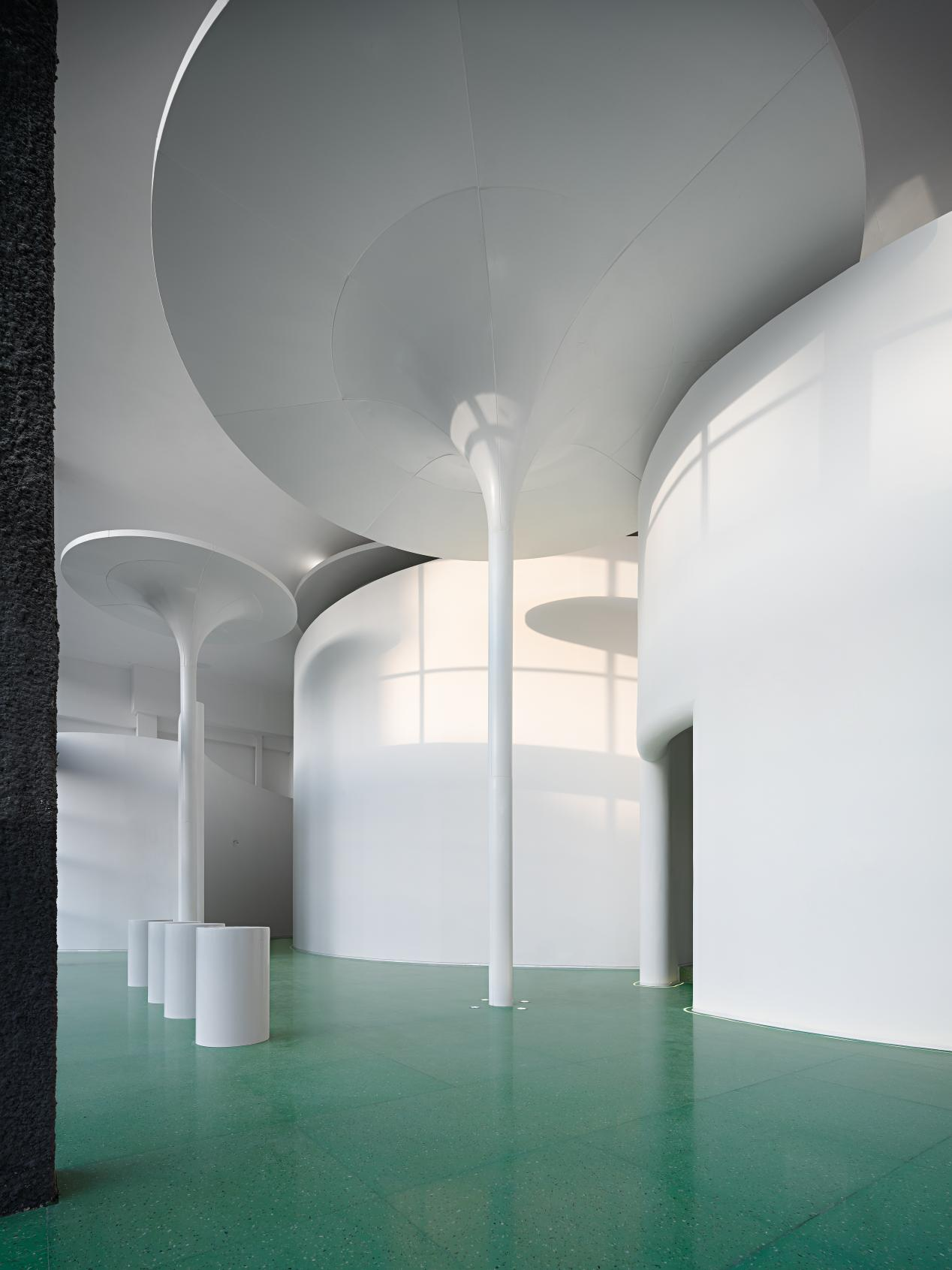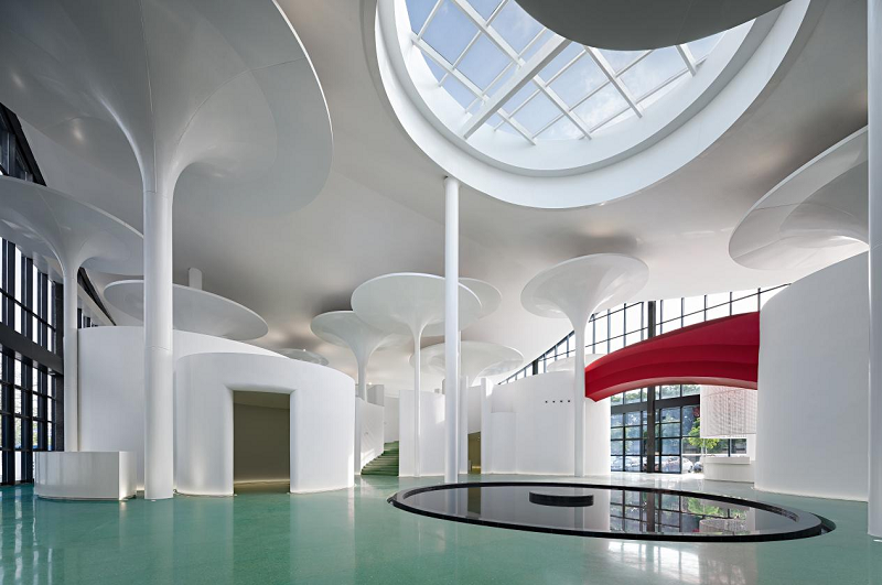 A famous author wrote "Everybody in China tended to love peony ever since the Tang dynasty, but I am most passionate about the lotus. The lotus grow out of the mud yet stay untarnished, they are pure and refreshing instead of being glamorous, and they are straight and open hearted". Lotus and water lilies flourish in the water towns of Dongguan. Inspired by the lotus leaf, the architect translated the lotus into the design and let it run through the whole space. Lotus leaf shaped structures of various sizes and heights stand in the site, creating a scene of "boundless green lotus leaves". It turns the gallery into an art of space as well as a space for art.