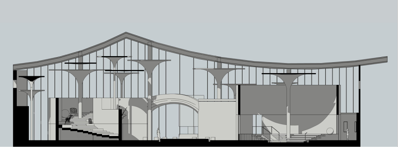 The overall architecture of Dongguan Hongmei Art Gallery shows an organic combination of traditional Guangdong architecture and modernity. It inherits the simplicity, transparency and elegance of traditional Guangdong architecture. It has adopted a sloping roof design typical of traditional Guangdong style, and has integrated many contemporary architectural elements. Its front and rear walls are made of light weight transparent glasses. Contemporary styling is used to shape a 10 meter diameter clear glass ceiling 15-meter above the ground level.