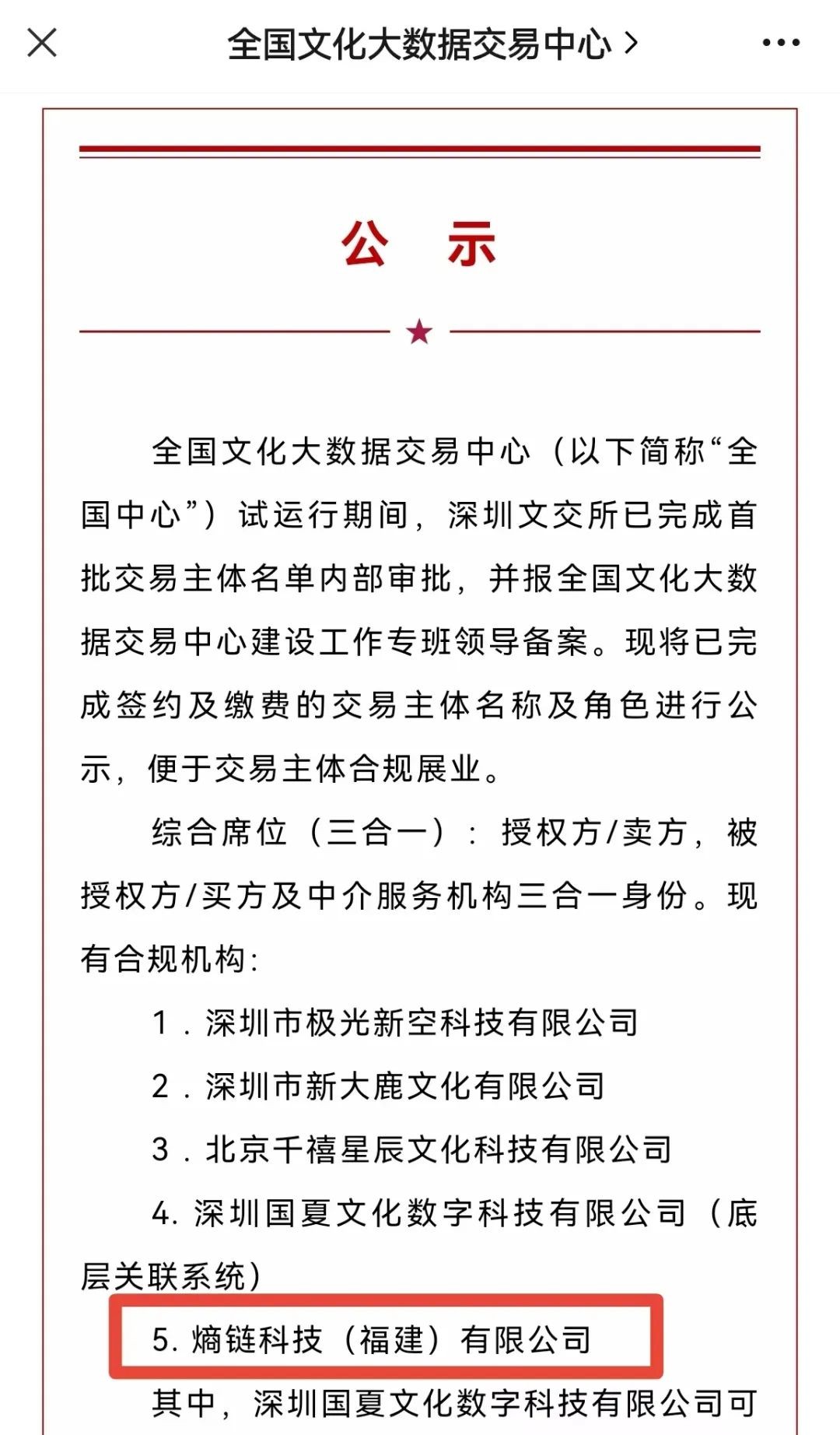8月12日,由深圳文交所承建的“全国文化大数据交易中心”公布首批交易主体名单。作为中国区块链行业的先行者和首批实践者,熵链科技(福建)有限公司成为全国首批5家入选单位之一,再次抢占市场先机,引领区块链行业发展方向。