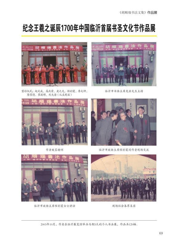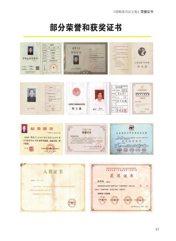2003年10月,在临沂展览馆举办个人书法展(临沂书法个人展首位)。作品多次入选国家、省、地市大赛并获奖。2009年8月,作品入选“辉煌”六十年、全国百名将军、百名部长、百名书画家作品联展(第十一届全运会组委会)。2012年8月,入选“首届山东省书法家协会会员千人双年展”(山东省书协)。2012年9月,入选“第六届中国中小学生书法节(教师组)作品展(中国书协),2013年7月,在清华大学美术学院举办个人书画展,出版发行《胡顺瑞书法作品集》。2014年6月,临创《大唐三藏圣教序》(全文)被鸿福寺收藏并镌刻石文(中国当代临创第一人)。2017年5月,荣获全国第五届“中国梦想杯”书画大赛金奖。