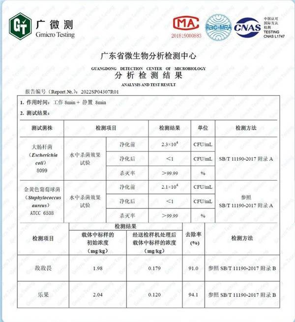 经广东微生物检测中心权威检测,小泽医生果蔬净化器除菌率高达99.99%,去农残率大于90%,效果非常显著,可放心使用。