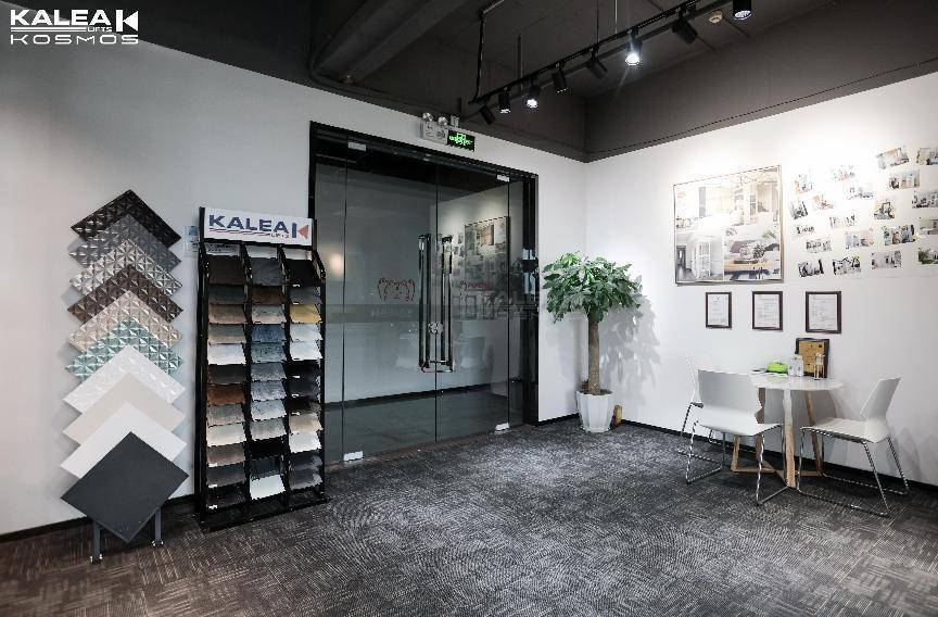 广州展厅整体简洁有格调,样机大胆选择耀幕闪耀系列——GOLD SPARKLE金色,颜值超高,和整体灰白色调形成对比碰撞,为展厅空间营造了时尚的空间体验感。