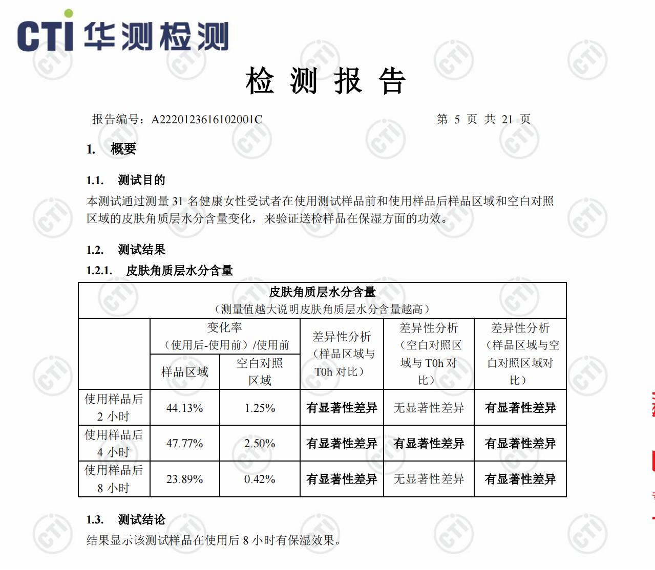 经第三方机构监测使用样品后2小时后角质层水分含量提升了44.13%;8小时后提升了23.89%,做到全天保湿,超长时间持续补水。