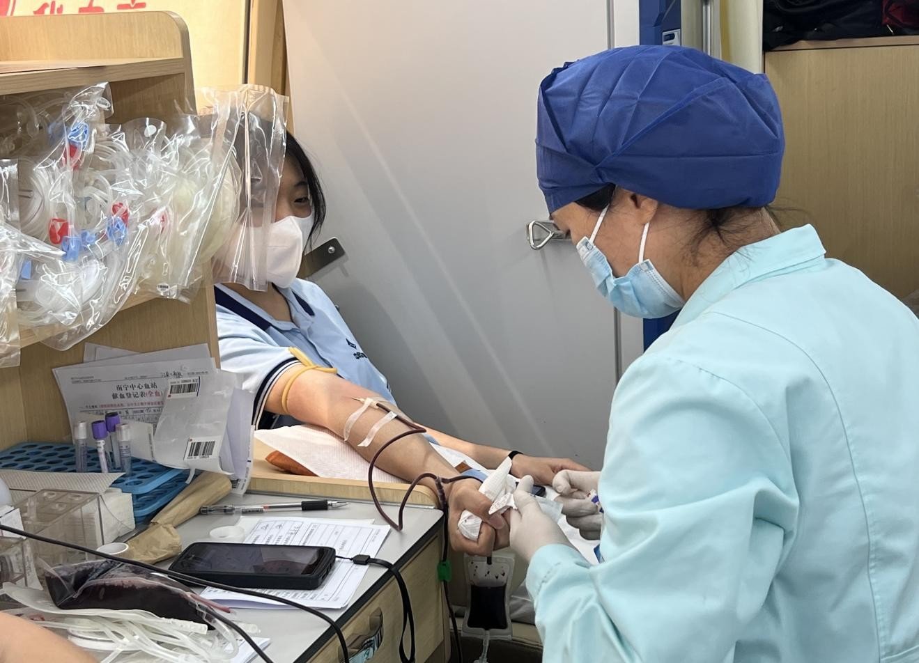 当天上午,杨飞董事长带领自愿参与献血的员工们来到献血点,顶着烈日,井然有序地进行登记、体检、量血压、测血型等准备工作,大家顺利通过各种必要检查后,登上献血车,撸起袖子,伸出手臂,坦然接受护士采血,只见涓涓热血缓缓流入一个个储血袋,200ml、400ml……杨飞董事长领头捐献了400ml热血,其他员工最少的也献了200ml,中务员工们用爱心汇聚成暖流,为生命接力!