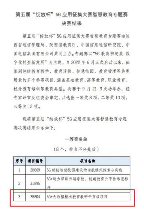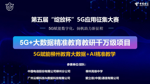 近日,第五届“绽放杯”5G应用征集大赛智慧教育专题赛颁奖仪式在陕西延安举行。由中国电信股份有限公司柳州分公司、柳州高级中学、云蝶科技、云数科技、爱立信联合打造的“5G+大数据精准教育教研千万级项目”,历经初赛、复赛、决赛的层层角逐,从全国464个申报项目中脱颖而出,最终荣获全国一等奖。