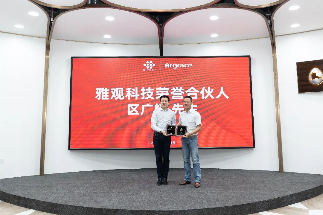 雅观科技合伙人胡晓东与卓满科技总经理何亮代表双方签署战略合作协议,雅观科技创始人、CEO顾志诚代表雅观科技授予区广耀先生荣誉合伙人称号,华艺集团、中国照明协会等单位主要负责人共同见证这历史性的时刻。