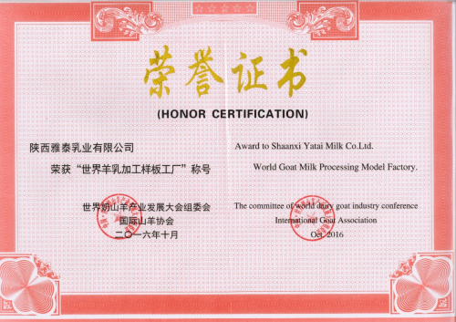 2016年10月,在世界奶山羊产业发展大会组委会授予认可下,雅泰乳业跻身于“世界羊乳加工样板工厂”行列。自此,拥有完整全产业链的雅泰乳业,完全实现了从全自动化到智能化的转变,并成为国产羊奶粉企业中生产能力最强,规模、智能化程度最高的乳制品企业之一。