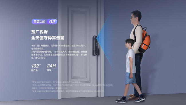 以萤石DL30V视频锁为例,它具备“远程可视对讲”和“视频录像”功能,内置300万超清像素的摄像头,搭载真实宽动态技术以及3米红外夜视,在黑暗环境下也能清晰拍摄门外画面,保证更优的猫眼显示效果。摄像头采用162°的超广角设计,可以拍摄1.3-2米高的访客。