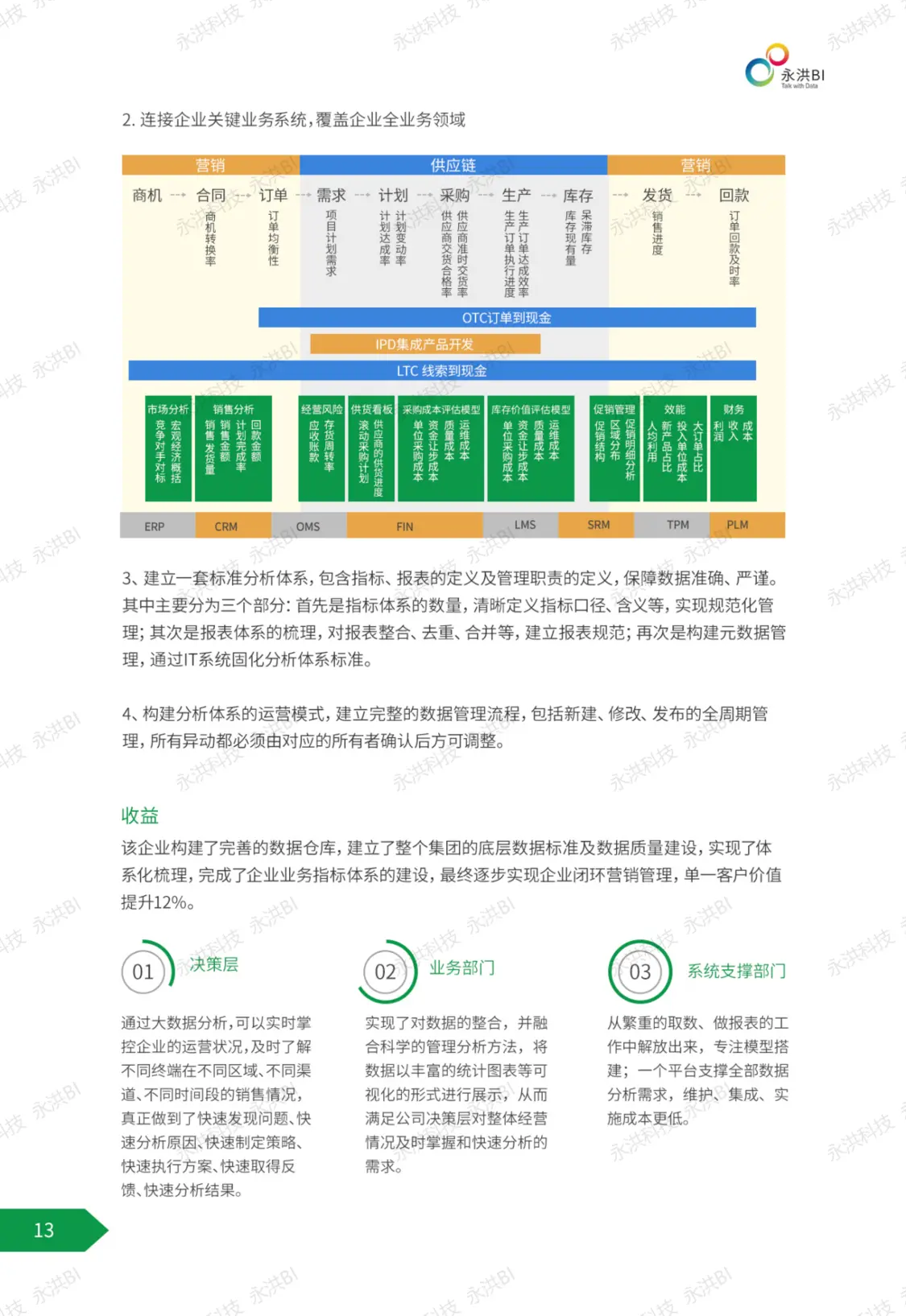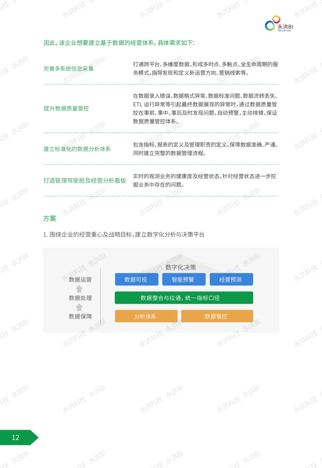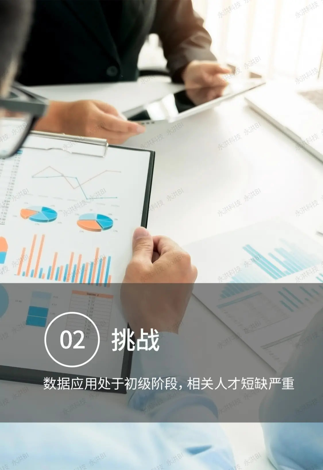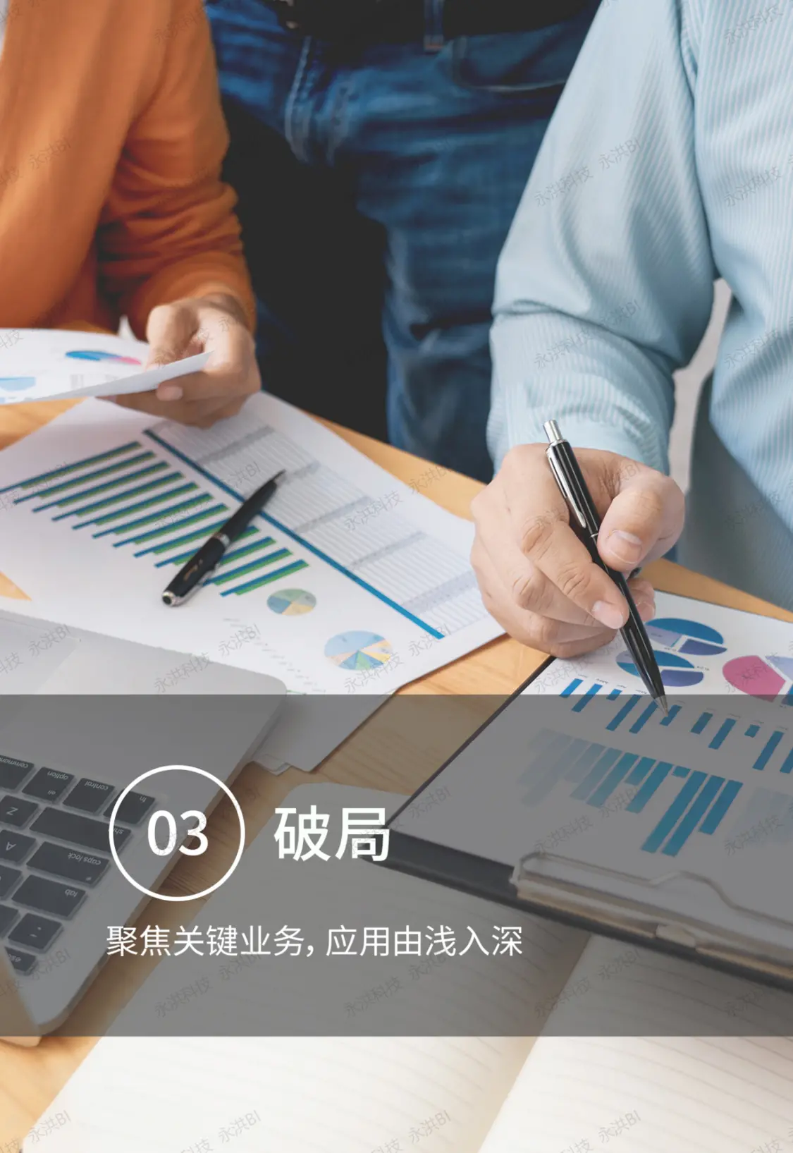 4、 构建全面的数据应用体系,关键在于要围绕业务线,确定自上而下的数据应用纲领,确保各层级、各业务部门的动作统一并形成合力。同时,由于资源的有限性,需要划分阶段实施,通常实施步骤为:首先构建整体经营分析看板,全面把控核心业务数据情况;其次构建关键业务的数据应用体系,并逐渐从关键业务延伸至相关业务;最后则是支持部门数据应用,如财务、人力等。