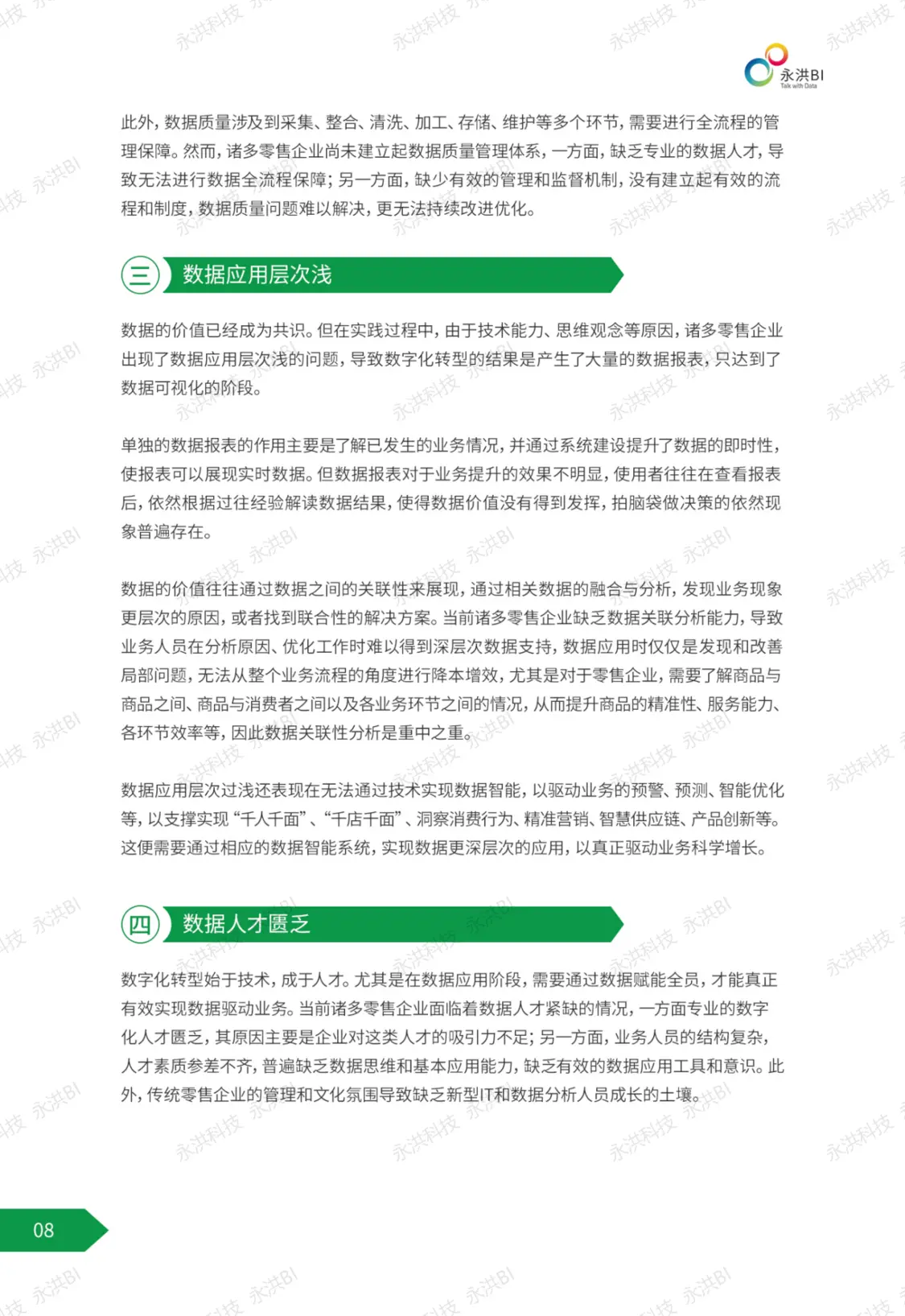 同时,诸多零售企业出现了数据应用层次浅的问题,导致数字化转型的结果是产生了大量的数据报表,对于业务提升的效果不明显,使用者往往在查看报表后,依然根据过往经验解读数据结果,使得数据价值没有得到发挥,拍脑袋做决策的依然现象普遍存在。