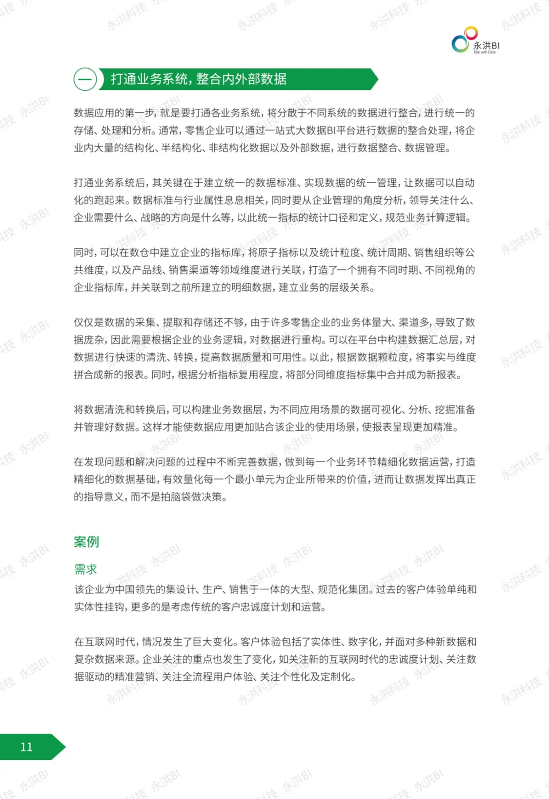 1、 数据应用的第一步,就是要打通各业务系统,将分散于不同系统的数据进行整合。零售企业可以通过一站式大数据BI平台进行数据的整合处理,将企业内大量的结构化、半结构化、非结构化数据以及外部数据,进行数据整合、数据管理;