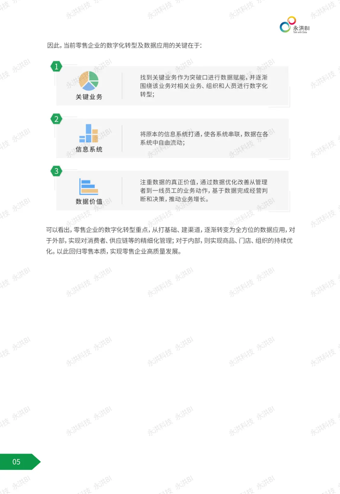 当前零售企业的数字化转型及数据应用的关键在于:一是找到关键业务作为突破口进行数据赋能,并逐渐围绕该业务对相关业务、组织和人员进行数字化转型;二是将原本的信息系统打通,使各系统串联,数据在各系统中自由流动;三是注重数据的真正价值,通过数据优化改善从管理者到一线员工的业务动作,基于数据完成经营判断和决策,推动业务增长。
