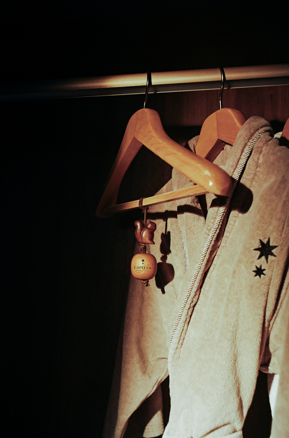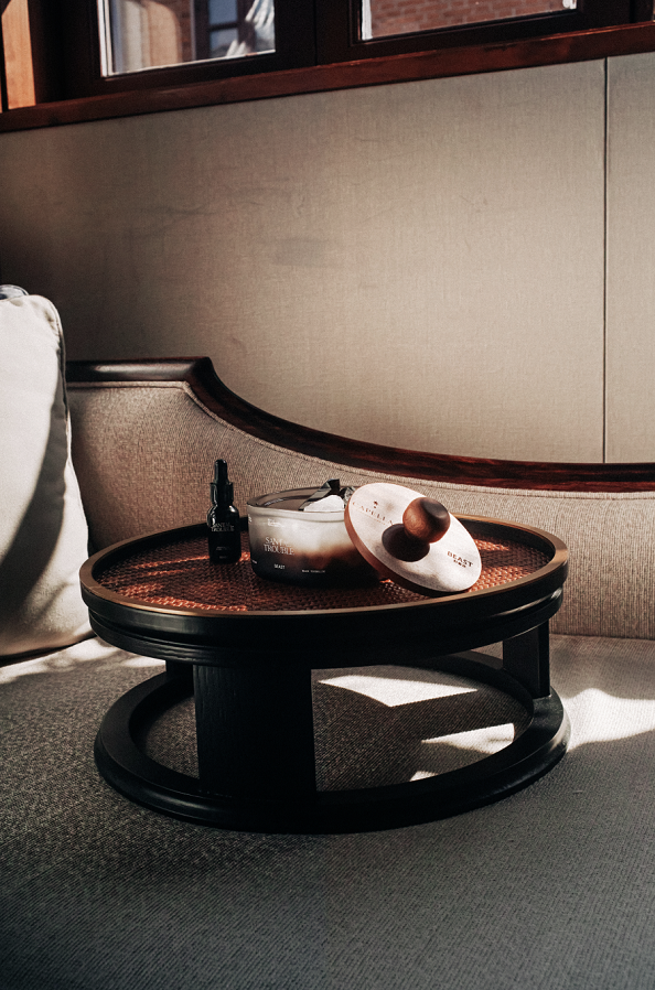 客厅桌子上摆放着一盏烛罩蜡烛,复古宫灯造型,点亮你的小小世界,角落里的柜子上摆着一盏散香器,芳香纯正,让房间里萦绕温暖木香。卧室床头、窗边则放着扩香晶石,莹润透彻,伴你入梦。除此之外,限定联名系列特别选用优质非洲乌檀木制作香氛配件,天然木材的颜色与纹路,每件产品都独一无二。纯净又充满力量的香气,让客人沉浸一场感官之秋。