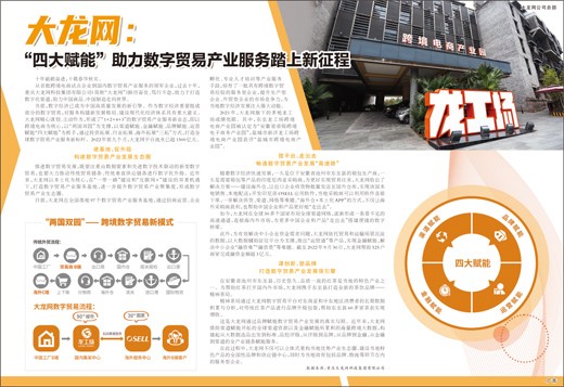 当前,数字经济已成为中国高质量发展的新引擎。作为数字经济重要组成部分的数字贸易,对服务构建新发展格局、建设现代化经济体系具有重大意义。大龙网精心谋划、主动作为,形成了“1+2+4+3”的数字贸易产业服务新业态,即以跨境电商为核心,以“两国双园”为支撑,以渠道赋能、金融赋能、品牌赋能、运营赋能“四大赋能”为抓手,通过投资拓展、行业拓展、海外拓展“三拓”方式,打造全球数字贸易产业服务新标杆。2022年前九个月,大龙网平台流水已超1500亿元。