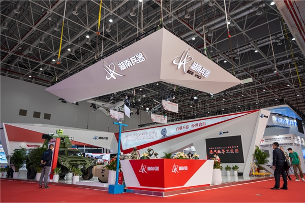 本次航展吸引了全世界高度关注,其中来自湖南军工企业湖南兵器工业集团(以下简称湖南兵器)携系列新型武器装备,再次亮相珠海航展。为了发挥军工企业的特色,湖南兵器以“利刃”为设计理念进行展厅造型设计。整体空间以硬朗锋利的直线条为主要元素,塑造出“利刃破空”“刚劲有力”空间感受。搭配机甲、枪炮等现代武器,整体呈现出“精锐”“锋利”的军工特质,整个展厅以“潇湘红”“纯净白”为主色调,突出湖南红色热土的地域特色,并以相对素净的色彩反衬武器本身的优势。而这个独具军工特色的展厅同时吸引了众多领导和专业观众的关注。
