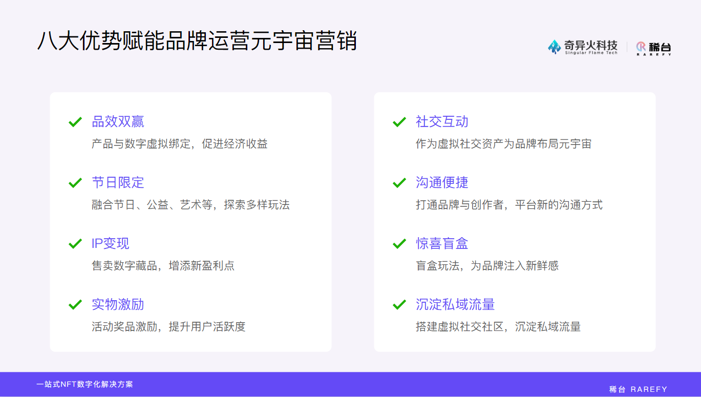 无论是哪个方向,如果品牌只把元宇宙NFT营销当做短期流量获取就狭隘了,真正发挥其价值,需要正视元宇宙现象背后的真相,并做好先播种后收获的心理准备。稀台可帮助品牌企业主们实现从私域流量进化到私域经济,智能虚拟化从营销突围,让很多品牌提前布局元宇宙尝到了元宇宙第一波营销红利,rarefy.cn