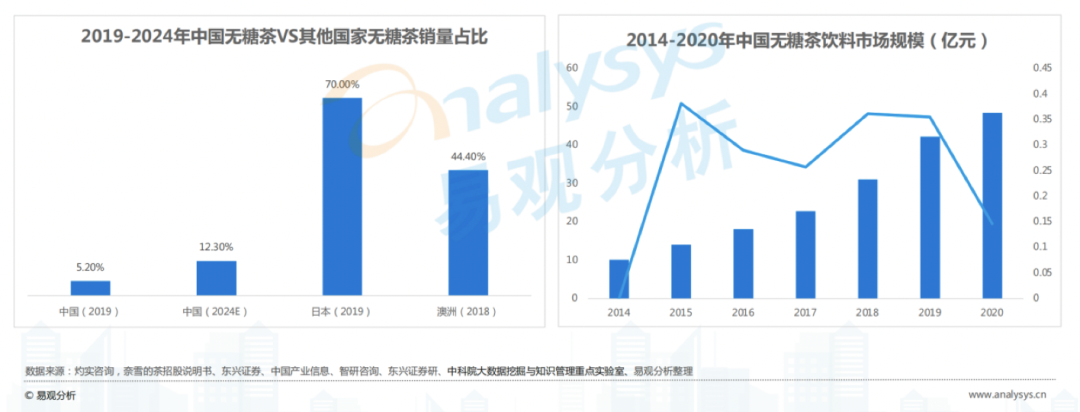 第一,从全球市场份额来考虑,茶是一个没有周期性的行业,而且增长空间很大。无糖茶饮料销量占茶饮料销量的比例,澳洲的数据大概是44%,日本约为70%。2019年,中国这个数据是5.2%,预计2024年到12.3%。