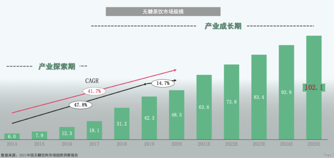 据此我们来算零售端的市场规模,中国饮料市场大概5000亿,算下来无糖茶饮只有接近100亿,规模比较小。但市场增速很快,年复合增长率超过40%,同期调味茶饮料增长只有3%左右。