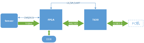 该方案可基于方寸T630高性能接口控制器芯片实现,方案前端摄像头将图像数据传输FPGA端处理,处理完的数据通过32位MUXIO连接我司接口芯片,MUXIO接口频率最高可达 120MHz,接口芯片将处理后的图像数据及视频数据通过USB3.0输出,传输速率最高可达420MB/s。该方案提供完整的SDK供客户进行定制化开发,尤其针对典型应用场景提供了源码级方案支撑,可帮助客户缩短产品开发周期、降低整体开发成本、提升产品市场竞争力。