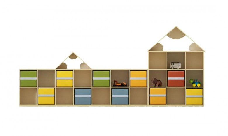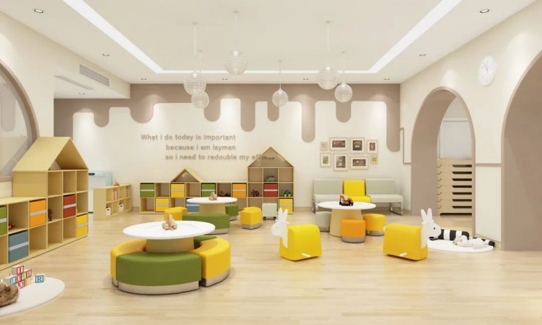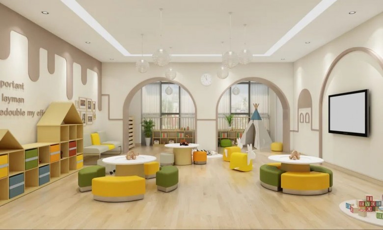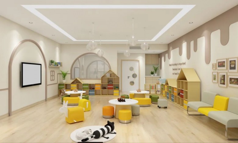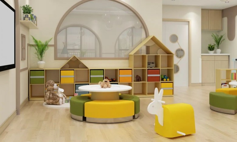 儿童等候区,主要是服务于儿童,包括玩具柜、手工桌、坐凳、排椅以及木马等。玩具柜设计简洁明了,方形框格可存放玩具,也可存放凳子,一格多用。