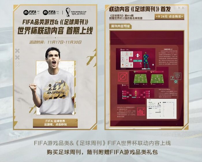 FIFA品类游戏从视觉、听觉以及玩法上围绕世界杯进行更新升级,希望在世界杯期间为玩家营造 一种“换我上场”真实氛围,与大家一起沉浸式感受足球的魅力。在游戏外,FIFA品类游戏为广大球迷玩家准备了一系列世界杯共庆活动,与世界杯赛程同步开启。FIFA品类游戏与《足球周刊》进行内容联动打造为期三期杂志内容,首期内容已于11月17日上线,凡购买足球周刊可获得随刊附赠的FIFA品类游戏礼包,为球迷在游戏内的世界杯之旅再添助力。
