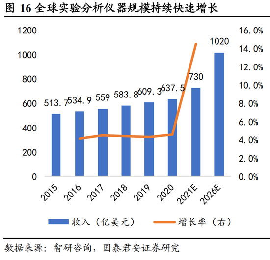 因此,生命科学仪器是国家重点支持发展的领域,已经被列为十四五规划重点支持产业之一。国泰君安(601211)证券估计,自2021年起,得益于全球研发投资的快速增长,全球实验分析仪器规模的增长率也将加快,预计2026年规模将达到1020亿美元。