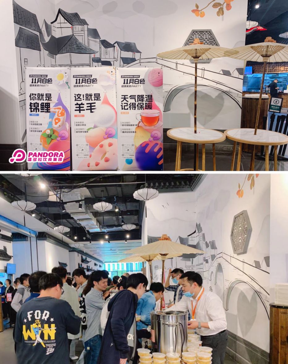以「潘多拉11月白色健康美食PARTY」为例,在杭州华为项目现场以“这!就是羊毛”、“你就是锦鲤”、“暖心姜茶免费喝”等互动形式,调动消费者参与热情,现场气氛欢快热烈。