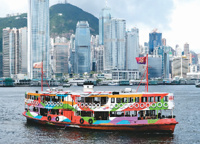 在香港尖沙咀天星码头,天星小轮载着庆祝香港回归祖国25周年标志的旗帜在维港航行。