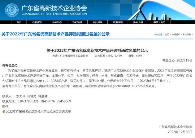 广东省高新技术企业协会于2022年9月27日组织开展“2022年广东省名优高新技术产品评选”工作,该评选活动旨在为提高科技创新策源能力,加快成果转化及产业化,聚力推进高水平科技自立自强,在全省范围内遴选一批创新能力突出、技术先进、质量可靠、市场前景好的产品。
