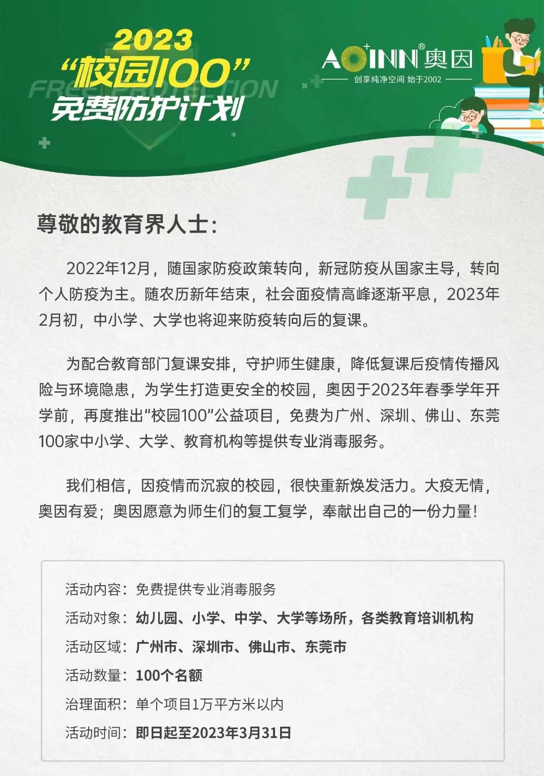 校园室内环境消毒,打造安全的学习、生活空间,是学校复课的基础环节之一,随复课进程的加快,校园内师生高密度聚集,又将为后续的防疫工作增加难度。将校园空间安全这道防线筑牢,将能很大程度上可降低师生的新冠感染机会。作为拥有21年历史的室内空气净化企业,奥因环保坚持社会担当、发挥专业优势,聚焦复课前各大教育机构的室内消毒需求,2023年春季复学在即,奥因环保为多家教育机构提供免费专业室内消毒服务的“校园100”公益活动。