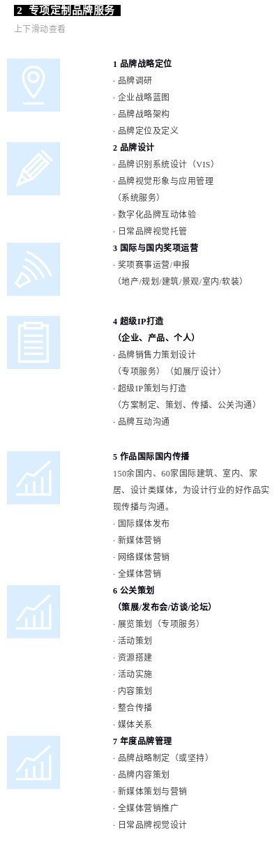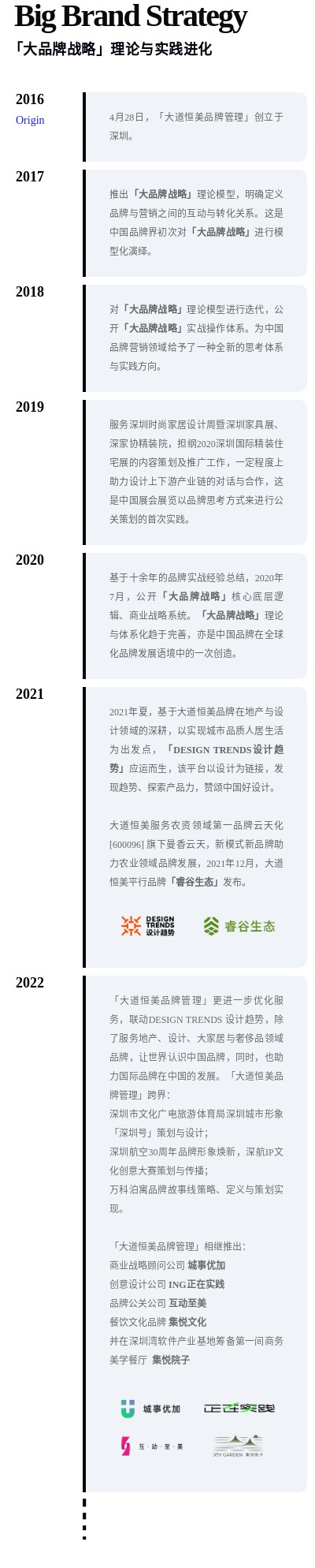 大道恒美服务于地产、设计、大家居与奢侈品领域的企业品牌,依据各自不同的品牌状态,制定个性化的品牌战略与行之有效的执行方案,7年间服务并见证了地产与设计领域TOP50的建筑、室内、软装、灯光、家具类企业的品牌生长,让各个领域的品牌拥有更多机会,实现更好的设计。