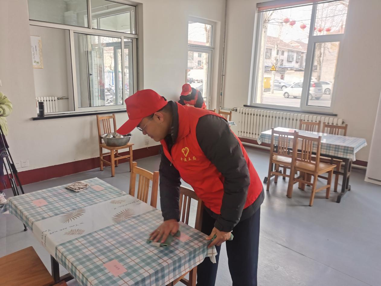 当天上午到达长者食堂后,支部党员明确分工、团结协作,擦桌子、整理物品、打扫院子等工作相继开展,为老人们打造了一个温馨干净的就餐环境。中午十一时许,老人们陆陆续续到达食堂,志愿者帮老人放好自行车,搀扶老人一一落座。“看见你们真高兴啊,他们都叫我老顽童,我就愿意和孩子们玩,虽然我90了,但我还能骑着三轮车自己过来啊!”90岁高龄的徐奶奶笑的合不拢嘴说道。