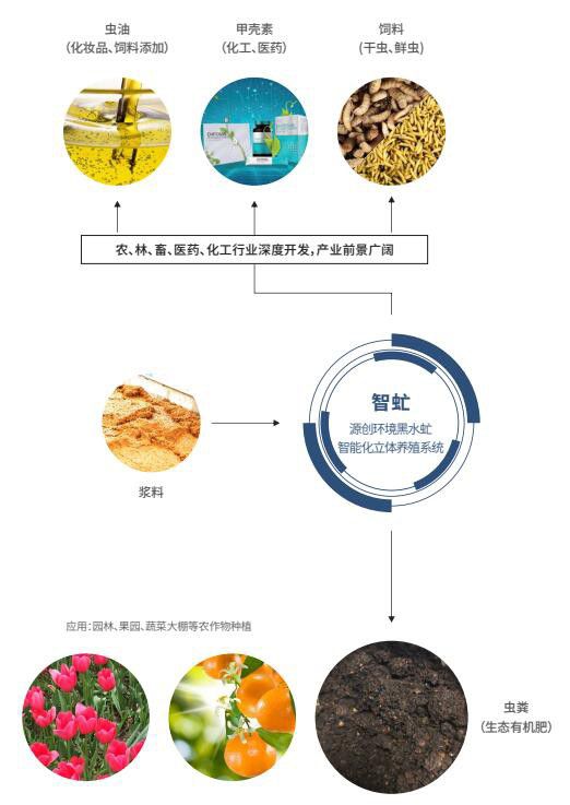 在“碳达峰、碳中和”的时代大背景下,源创环境可以说为环保行业提供了一条低碳、循环、高效、高价值的有机废弃物资源化路径,“智虻”循环经济模式依托“餐厨、厨余、畜禽粪便等湿垃圾+黑水虻”核心,形成“餐厨/厨余/畜禽粪便/农业加工副产品等有机废弃物——生物蛋白——农业养殖/种植”的循环经济模式,由此可打造“湿垃圾处理基地+农产品深加工基地+禽畜养殖园+蔬果种植园+生态农庄+生态旅游”综合经济体,能有效改善村镇环境建设,大幅降低垃圾处理成本,带动农村创业、就业,构建有机生态农业品牌,在实现国内生物蛋白饲料自给的同时还可以向海外输出中国优质的饲料及农产品。