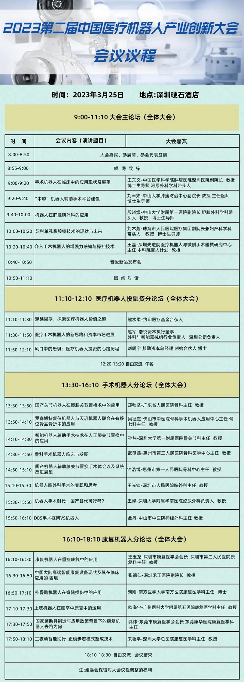 在此背景下,由中国医疗机器人产业创新大会组委会、智慧医疗网、智慧产业网、科雷会展联合主办;科雷会展承办的“2023第二届中国医疗机器人产业创新大会”将于3月25日深圳召开,本届大会将涵盖行业热点趋势前瞻、典型项目案例分享、前沿技术应用实践,助力中国医疗机器人产业在数字经济浪潮下快速转型与升级。