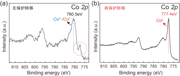 (a)样品在无保护状态下测得的Co2p谱图,(b)样品在保护转移状态下测得的Co 2p谱图