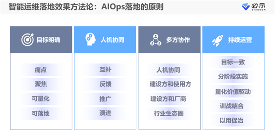 智能运维(AIOps)概念提出到实施落地已有多年,伴随着业界一些AIOps项目的落地实施,业内逐渐对智能运维的价值、效果和建设路径等方面产生疑惑。作为深耕于金融行业智能运维产品研发与落地实施的国家高新技术企业-必示科技,通过服务60余家金融头部企业的经验,经过多年的技术探索和工业实践,总结出了聚焦智能运维落地效果方面的方法论:即目标明确、人机协同、多方协作、持续运营。