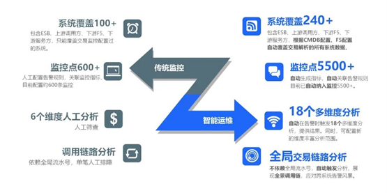 某银行使用必示智能运维产品后,无论从系统覆盖和监控点的数量、分析维度均有较大幅度的提升,同时分析链路上也从调用链路分析升级到了全局交易链路分析。