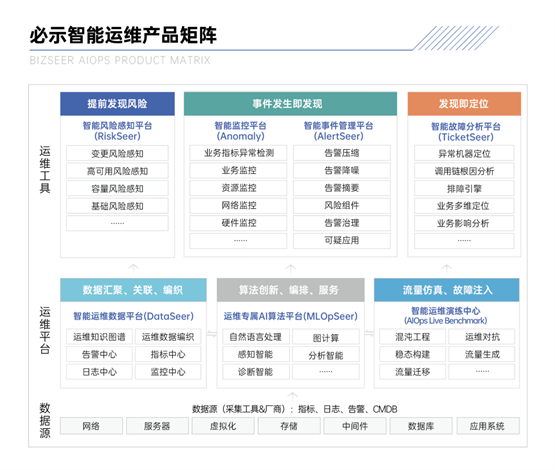 必示科技经过持续的技术研发、工业实践和产品迭代,推出了满足AIOps事前、事中、事后阶段均对“运维系统稳定性”产生价值和效果的必示智能产品矩阵。