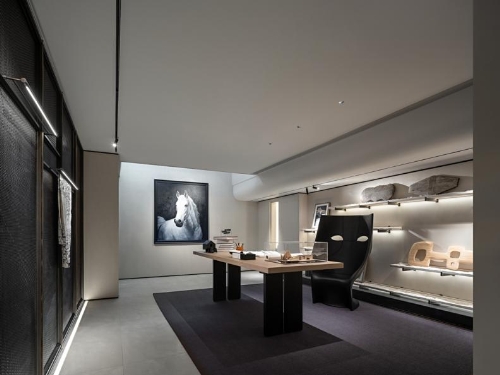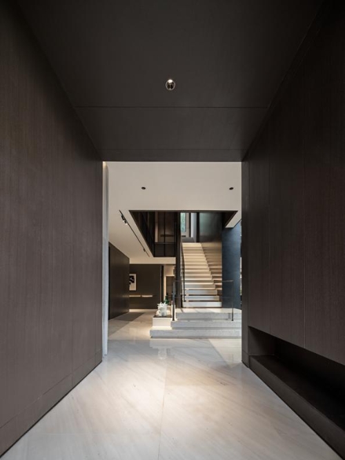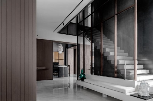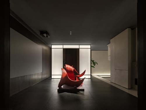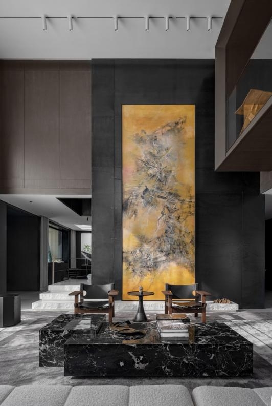 过渡场景的界限感,由居家动线中桩桩件件的艺术装置串联起来,自由成形。设计师攫取书法艺术中的藏锋之道、岫锋之法,以笔走龙蛇的水墨画,渲染着浑厚的当代东方意蕴。