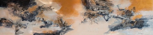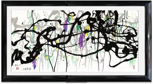 香港艺术家林仲文常常化用生活中的风、雨、云、月光、四季为虚幻意象,透过大气的构图,让材质与色彩激烈碰撞,形成了独特风格。在《无界·意象》的创作上,他画中的幻境与墨色无界交融,而且不断变化,寓意着“春回大地,万象更新”的磅礴新生。