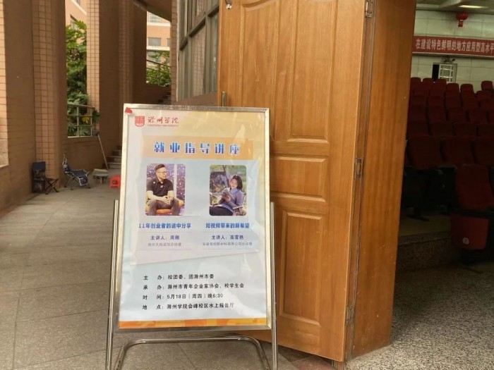本次大学生就业指导讲座主题分别为《11年创业者的途中思考》、《短视频带来的新希望》,出席本次活动的主讲人为滁州久烁装饰总经理周刚及安徽泉翔新材料有限公司总经理高雪艳。