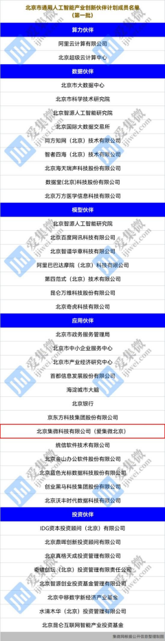 近日,北京市经信部门联合市科委中关村管委会、市发改委共同启动“北京市通用人工智能产业创新伙伴计划”,并发布第一批39家北京市通用人工智能产业创新伙伴计划成员名单。其中,算力伙伴2家,数据伙伴9家,模型伙伴7家,应用伙伴13家和投资伙伴8家。爱集微作为应用伙伴入选名单。