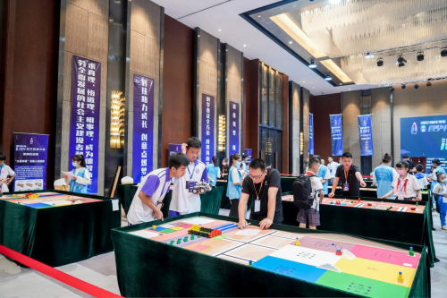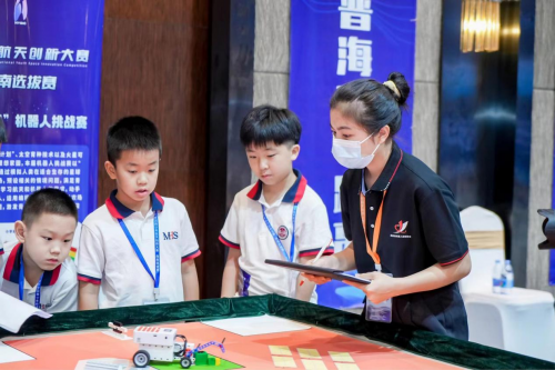 太空探测竞技赛区中,又是另一番景象,各参赛队伍斗志昂扬、摩拳擦掌、力争上游、热火朝天,场面热闹非凡。选手在竞技赛场中相互竞争,利用自己参与搭建、编程、控制的机器人完成相应的太空任务。体现了青少年通过动手实践,利用机械学、人工智能技术等知识将想法变为现实的能力。