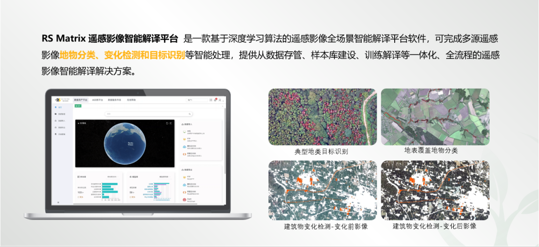 方案拥有强大算力与深度学习框架做支撑,可提供一站式深度训练平台服务,完成对多源遥感影像地物分类、变化检测和目标识别等场景的一键式智能解译处理。将能够以更灵活的产品架构和应用满足人工智能多硬件平台搭载需求,服务于自然资源、农林水利、能源双碳、数字乡村等行业遥感影像解译场景的高性能、智能化服务能力。