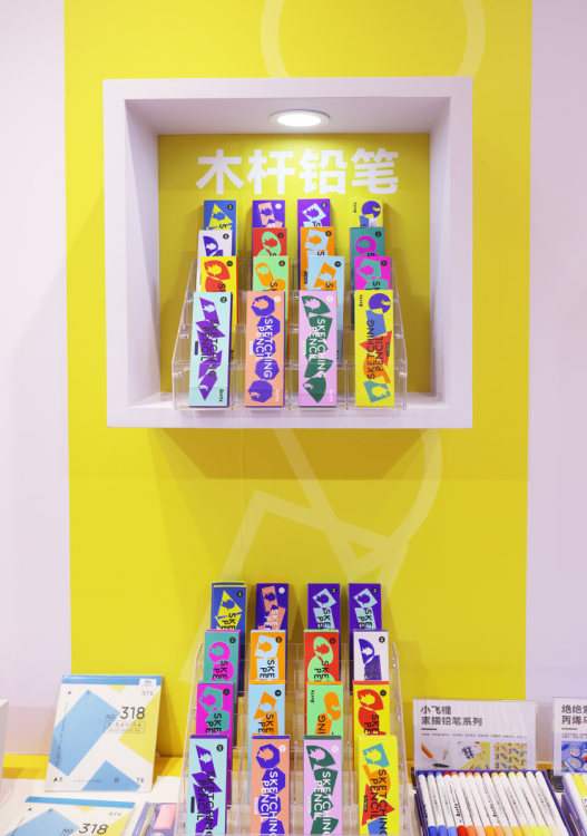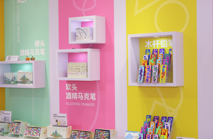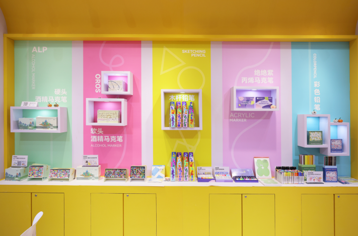 4900多支丙烯马克笔做成有趣的Arrtx彩虹墙,展厅内的产品陈列设计根据产品外观、颜色等精心摆放,精致感满满。