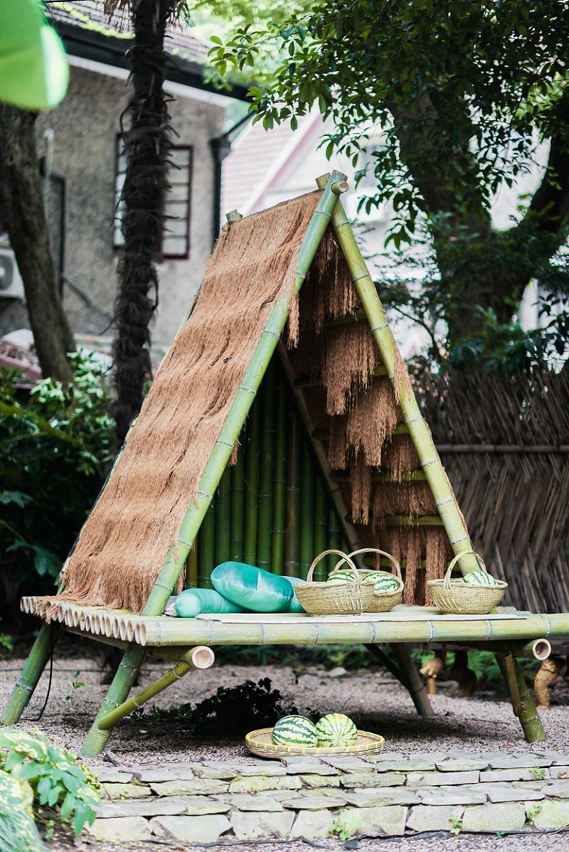在竹架与绿植中散落的是野兽派×丰子恺 悠悠夏日长香氛系列,毛桃、夏荷、夜来香,三种香气,营造丰子恺笔下的消夏体验。