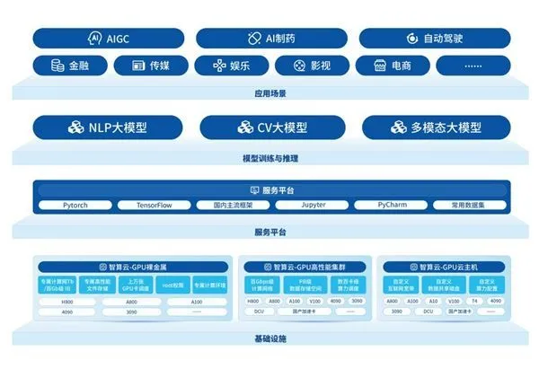 并行智算云是并行科技针对人工智能和高性能计算场景的算力服务平台,面向企事业单位、高校、科研院所在人工智能领域和高性能计算等方向的GPU算力需求,提供专业、海量的GPU算力云。通过云主机、高性能集群和裸金属三大产品体系支撑,基于高性能计算环境构建GPU算力服务平台,以满足大规模预训练、微调、高并发推理和高精度科学计算中对计算、存储、网络等环节的多样性需求。