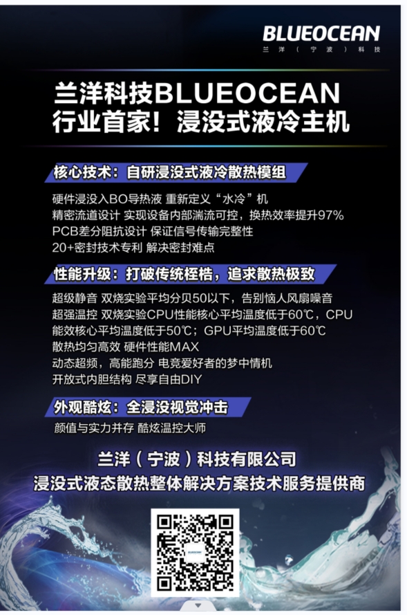兰洋(宁波)科技是行业首家浸没式液冷主机开创者,浸没式液态散热整体解决方案技术服务提供商,致力于打造国内第一液态散热品牌。2022年完成浸没式液冷标准模组智能厂房搭建,以承接前置散热模组服务器业务,产业化方面处于国内前沿地位。兰洋科技围绕智能液冷温控技术、数值模拟技术、密封技术、多元化模块部署技术、材料研发技术等应用于浸没式散热方案的核心技术,可覆盖液态散热全场景。2021年,率先完成高性能液体PC产品,成为能够在小型化电子设备实现浸没式液态散热的企业,并与国内PC品牌合作发售行业首款浸没式液冷量产主机,预约人数破3000+,仅397秒售罄。